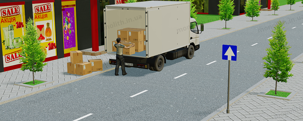 Цим пунктом також встановлено, що вантажні автомобілі з дозволеною максимальною масою понад 3,5 т, самохідні машини та механізми можуть зупинятися ліворуч у населених пунктах на дорогах з одностороннім рухом у дозволених випадках лише з метою навантаження чи вивантаження. Використання лівої смуги для зупинки (стоянки) транспортних засобів за наявності розподільної або бульварної смуги забороняється.