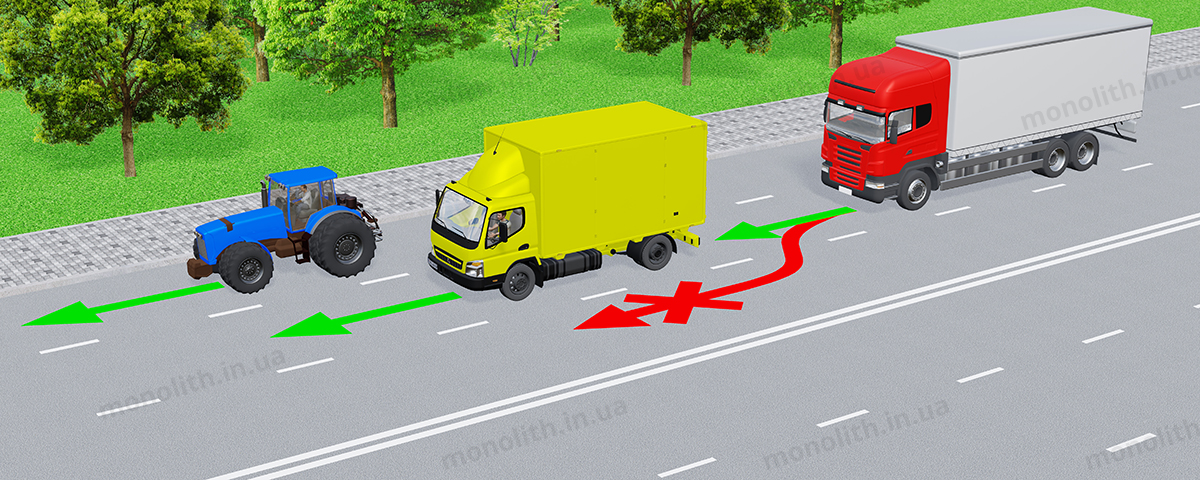 Оскільки вантажні автомобілі з дозволеною максимальною масою понад 3,5 т, трактори, самохідні машини та механізми менш маневрені та не можуть розвивати досить високу швидкість, їм забороняється виїзд на крайню ліву смугу, яка має залишатися вільною для руху швидкохідних транспортних засобів — легкових автомобілів, швидкої медичної допомоги, пожежних, оперативних та аварійних служб.