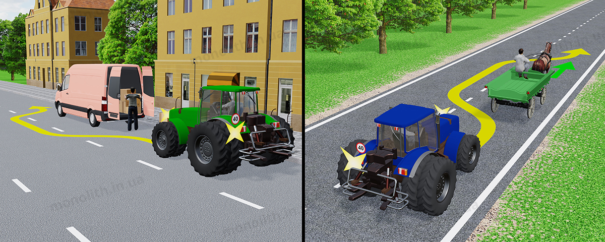 Через особливі умови руху транспортних засобів або через технічний стан транспортних засобів, внаслідок чого вони не можуть розвивати швидкість більше 40 км/год (на них встановлюється знак обмеження швидкості 40 км/год), такі учасники дорожнього руху мають рухатися в межах правої смуги, якнайближче до правого краю проїзної частини. Їм дозволяється виконати обгін, об’їзд або перестроювання на ліву смугу перед поворотом ліворуч або розворотом.